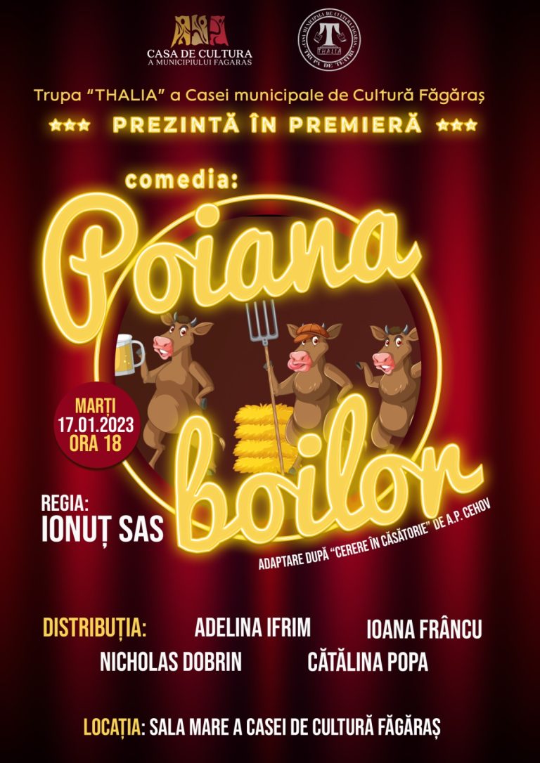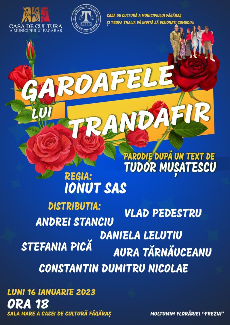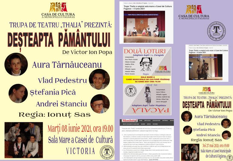 Galerie foto - video Primul spectacol al Trupei „Thalia” în anul 2023 a fost prezentat la Căminul Cultural Rucăr, în data de 04 ianuarie.”Garoafele lui Trandafir” de Tudor Muşatescu Anul 2022 Piesa de teatru „Ursul” a fost premiată la Festivalul de Teatru pentru Liceeni – ”Primavera”. Sinaia 2022Locul IPremiul pentru cel mai bun actor în rol principal – Andrei Stanciu.Premiul pentru cea mai bună actriță în rol principal – Aura Tărnăuceanu Premiul II obținut de Constantin Dumitru Nicolae la Festivalul de Teatru „Ion Luca Caragiale” – Ploiești 2022 Anul 2021 Pupăza din tei – povestitor Adelina IfrimMoment premiat la Festivalul „În lumea lui Creangă” – Câmpulung Moldovenesc 2021 Corina Pușcă și Ionuț SasScenetă prezentată de Valentine’a Day -2021 „La porțileThaliei” – Spectacol prezentat pe scena Teatrului Maghiar „Tamási Áron” din Sf. Gheorghe în anul 1997.Datorită calitatății foarte slabe a parții audio, aceasta a fost înlocuită cu muzică de fundal.Cu acest spectacol Trupa „Thalia” a Casei Municipale de Cultură Făgăraș a participat la Festivalul de Teatru „Concordia”.
